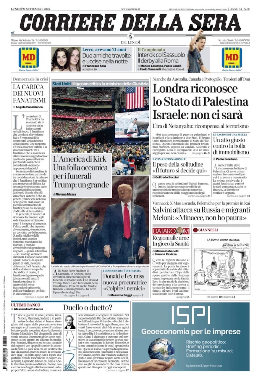 Queste le prime pagine di alcuni quotidiani in edicola oggi, lunedì 22 settembre 2025.