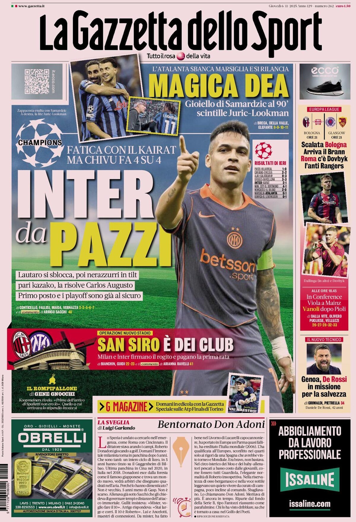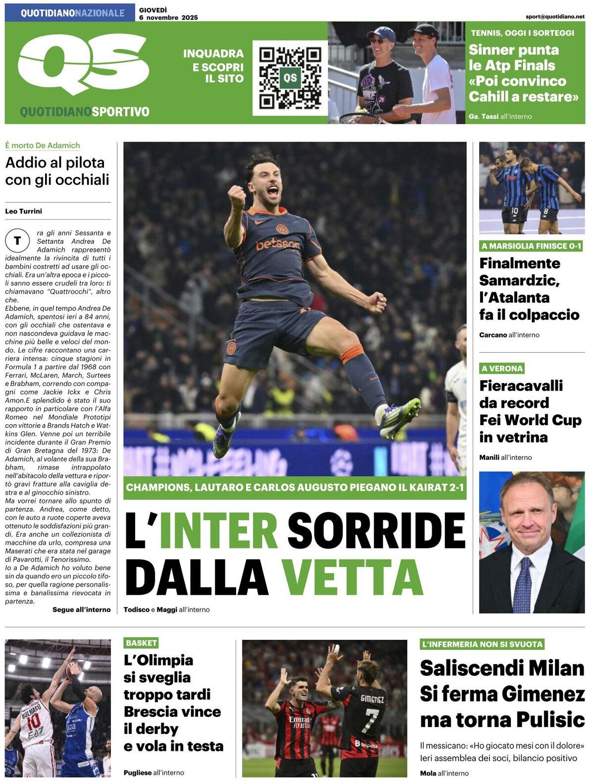Queste le prime pagine dei principali quotidiani sportivi nazionali in edicola oggi, giovedì 6 novembre 2025.