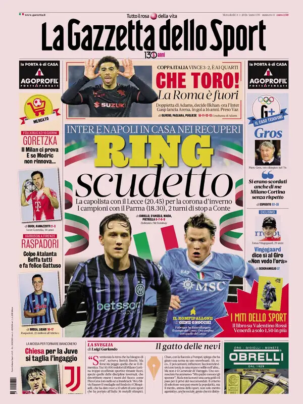 Queste le prime pagine dei principali quotidiani sportivi nazionali in edicola oggi, mercoledì 14 gennaio 2025.