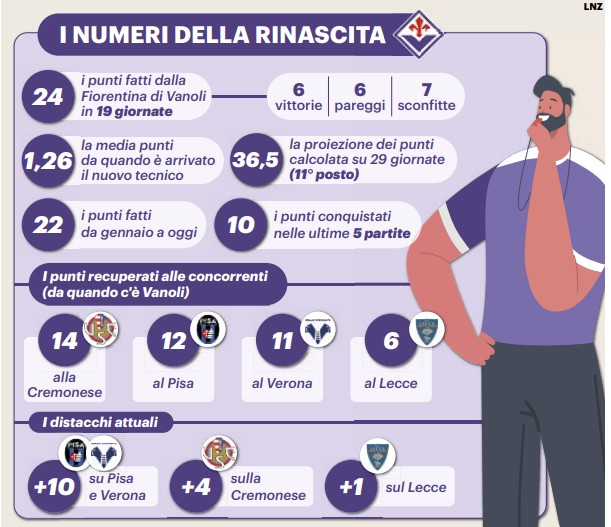 La Nazione oggi in edicola analizza tutti i numeri di una Fiorentina che si è finalmente allontanata un po' dalla zona salvezza con la vittoria contro la Cremonese. Il quotidiano sottolinea come la svolta sia arrivata soprattutto nel 2026, con Vanoli che in 19 giornate ha portato a casa 24 punti frutto di 6 vittorie, 6 pareggi e 7 sconfitte. Una media punti da 1,26 che permetterebbe alla Fiorentina di salvarsi facilmente: da gennaio ad oggi sono 22 i punti, di cui 10 nelle ultime 5 giornate. Da quando c'è Vanoli la Fiorentina ha recuperato 14 punti alla Cremonese, 12 al Pisa e 11 al Verona, portandosi a +10 su queste ultime due. Nel girone di ritorno la Fiorentina è a 15 punti, gli stessi di Roma e Lazio e due in più del Bologna. Numeri da medio-alta classifica. Nell'immagine i numeri in questione riportati dal quotidiano: