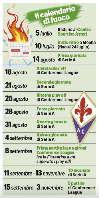 Un tour de force fatto di 23 partite in poco più di 90 giorni attende la Fiorentina per la prossima stagione, spiega La Nazione oggi in edicola (che offre lo schema in calce all'articolo). Si comincerà con un agosto mai così torrido, visto che tra il weekend del 13-14 e il turno infrasettimanale del 31 dello stesso mese saranno ben sei gli impegni ufficiali: le prime quattro giornate di campionato più l’andata e il ritorno degli spareggi di Conference League, dove l’avversario dei viola sarà noto solo diciotto giorni prima.
